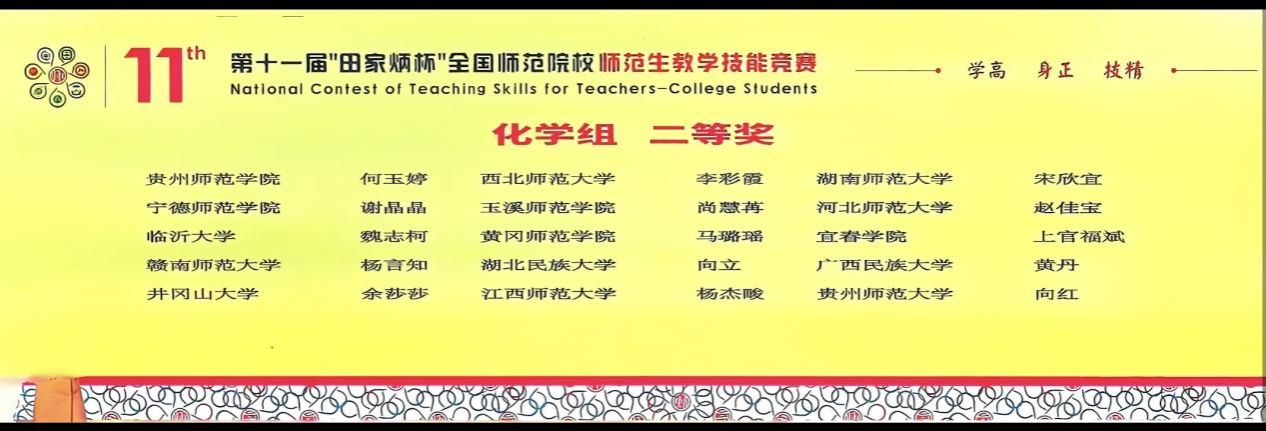 2025年11月28日至30日,第十一届“田家炳杯”全国师范院校师范生教学技能竞赛在浙江师范大学圆满落幕。化学与环境工程学院曾艳萍、李琛、吴云英老师指导的22级化学(师范)专业尚慧苒同学,作为云南省化学学科唯一入选决赛的选手,凭借深厚的专业素养与亮眼的教学风采,成功斩获二等奖。