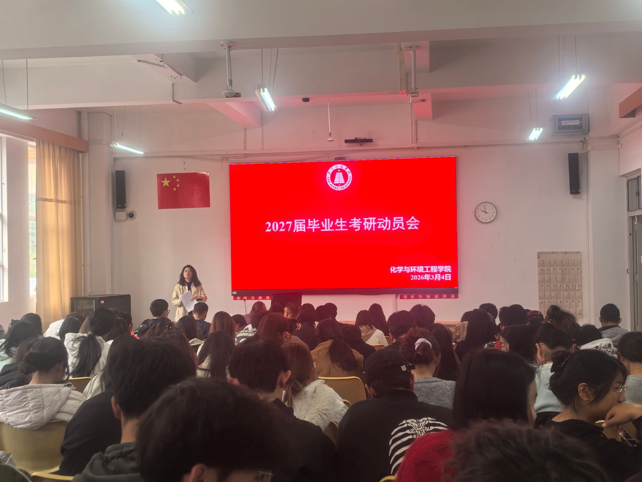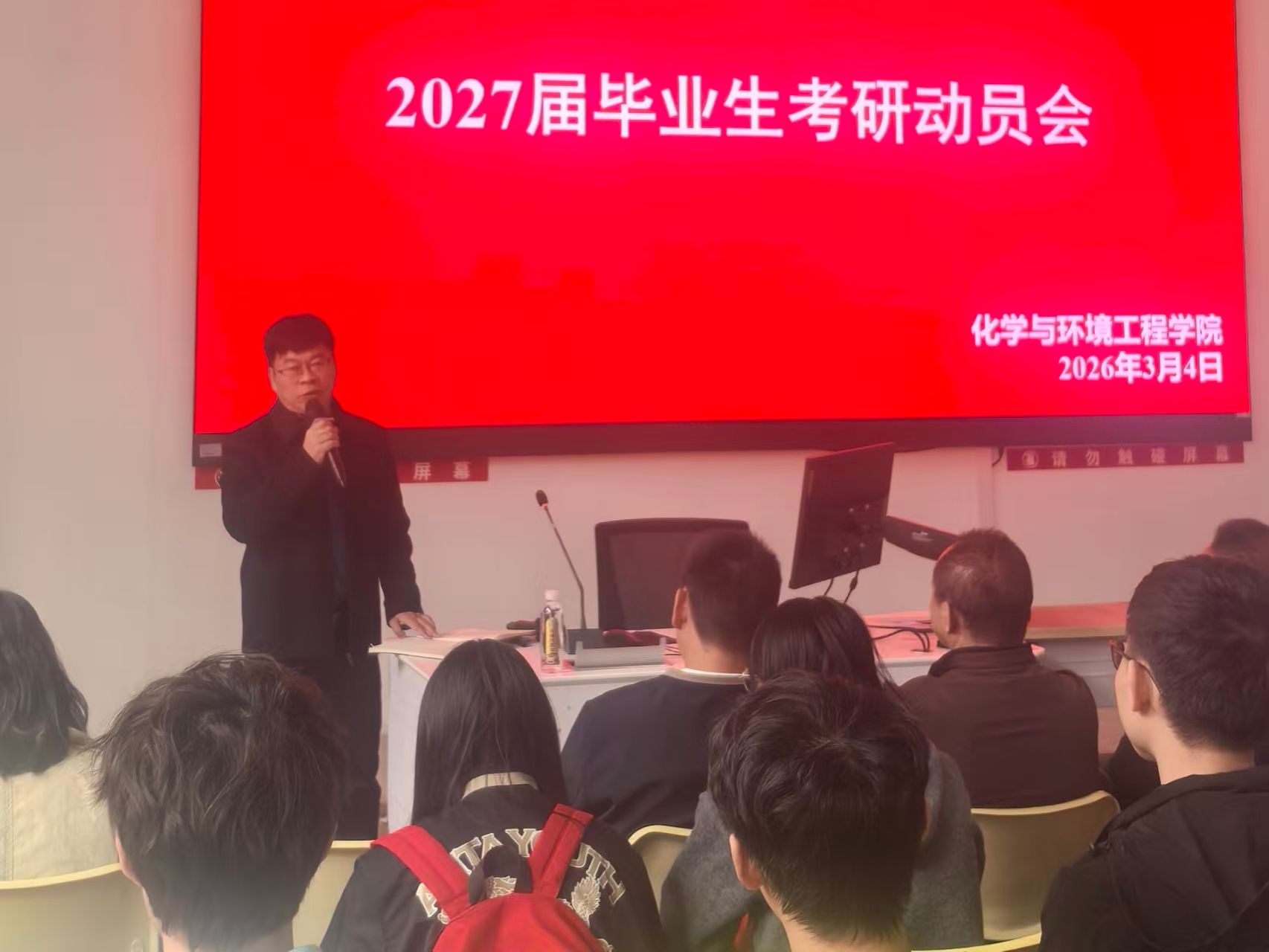 为积极响应国家深化研究生教育改革号召,切实助力2027届毕业生实现学术深造梦想,化学与环境工程学院于2026年3月4日10:00在14教103教室隆重举行“点燃考研梦想,铸就学术未来”2027届毕业生考研动员会。活动通过领导动员讲话、杰出校友分享、考情分析、在读硕士研究生经验传授等多元环节,全面激发学生备考热情,营造积极向上的考研氛围。会议邀请了三位杰出校友,分别是普洱学院实训中心主任、教务处副处长张建强教授,橙啦考研玉溪分校校长王万胜,以及学院资源与环境专业在读硕士研究生马灵。党委书记万永坤教授、院长叶长兵教授、党委副书记曹玉娟老师、辅导员、班主任、2027届全体毕业生出席本次会议,会议由曹玉娟老师主持。