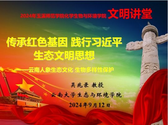2024年9月12日,在图书馆多元文化报告厅,以“传承红色基因、践行习近平生态文明思想”为主题,邀请云南大学吴兆录教授为我院2024级新生开展“云南生态文化-兼谈生态多样性保护”生态文明教育。此次活动由学院副院长周元清老师主持,党委副书记高进波老师、党委委员张翠萍老师、团委书记刘淑娟老师、2024级全体新生参加活动。