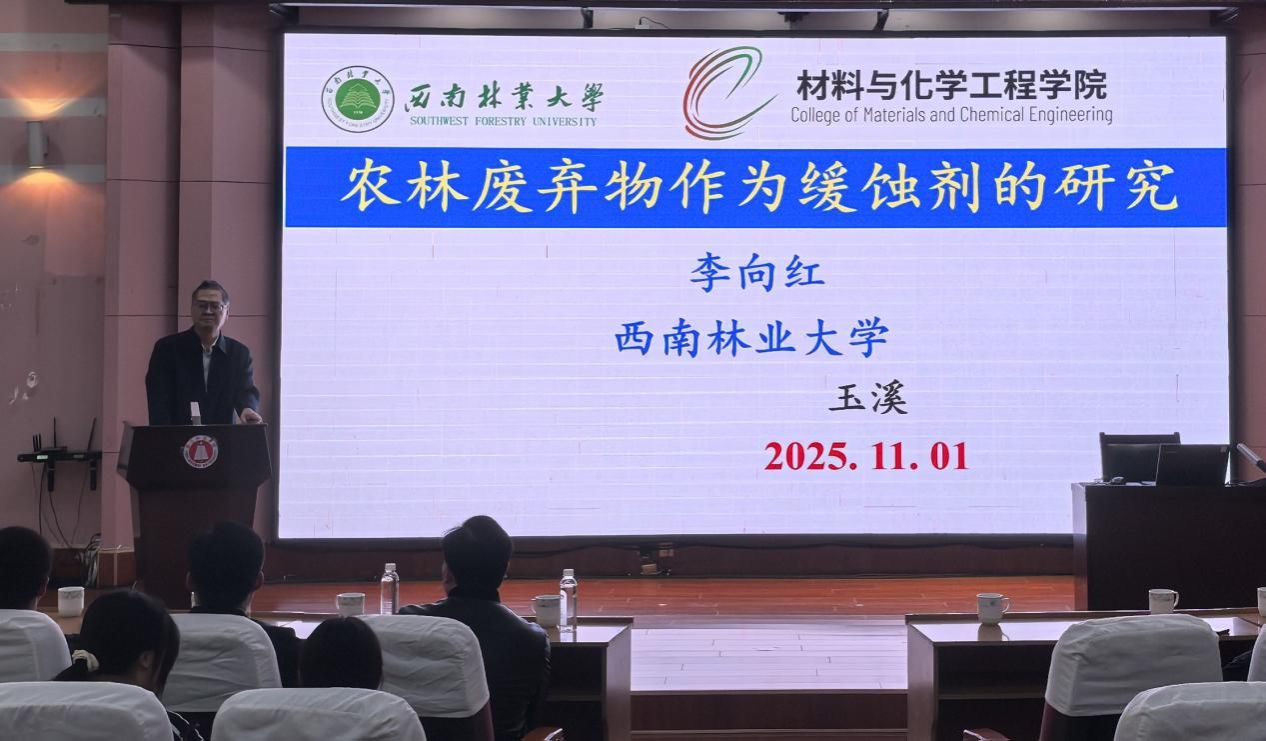 11月1日下午15:00,西南林业大学材料与化学工程学院院长李向红教授应邀做客玉溪师范学院“红塔讲坛”,开展题为《农林废弃物作为缓蚀剂的研究》的精彩讲座。出席本次讲座的嘉宾有云南大学资产与实验室管理处处长高红飞副研究员,昆明医科大学药学院孙忠文副教授,西南林业大学材料与化学工程学院雷然高级实验师,西南林业大学材料与化学工程学院吴浩博士。本次会议由玉溪师范学院党委委员、副校长李明教授主持,化学与环境工程学院党委书记万永坤教授、院长叶长兵教授、胡栋宝教授、陈文静副教授、董伟博士、杨帆博士、溥存继博士、庄小翠博士,化学、应用化学专业2023级、2024级学生参与本次讲座。