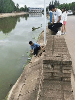 由于杞麓湖采取的是封闭式管理,车辆不能驶入湖边,所以今天的采水工作比较困难。最终我们只能选择将车辆停在路口,步行到各个采水点进行取水。采水点共有6个,分别为红旗河、者湾河、3个不同位置的杞麓湖湖水以及补水口。采水分为三个步骤,首先用纯净水润洗采样瓶3次,其次再用要采取的水样润洗3次,最后取水300ml于采样瓶上标注好时间地点即可。水样采集结束后,需要带回学校进行冷冻处理,等待后期再进行水质的检测。