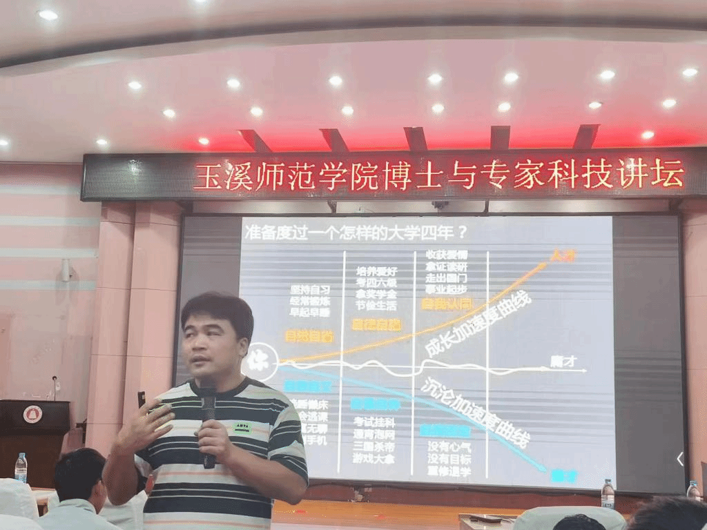 为了让学生们在大学里找到前进的方向,在面对人生的前景时不再迷茫。化学生物与环境学院于2023年10月29日在科学讲堂举行了玉溪师范学院博士与专家科技讲堂。此次活由团委书记刘桥刚主持、李晋明、叶长兵、刘宪斌、巢凯翔老师以及200余名学生参加了此次活动。