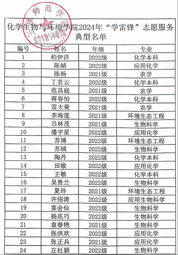 为选树一批“学雷锋”志愿服务典型,化学生物与环境学院于2024年3月开展了“学雷锋”志愿服务典型评选活动。根据玉溪师范学院2023年度优秀青年志愿者评选结果,吕林茂、雷大菊等24位同学被评选为“学雷锋”志愿服务典型,名单如下:
