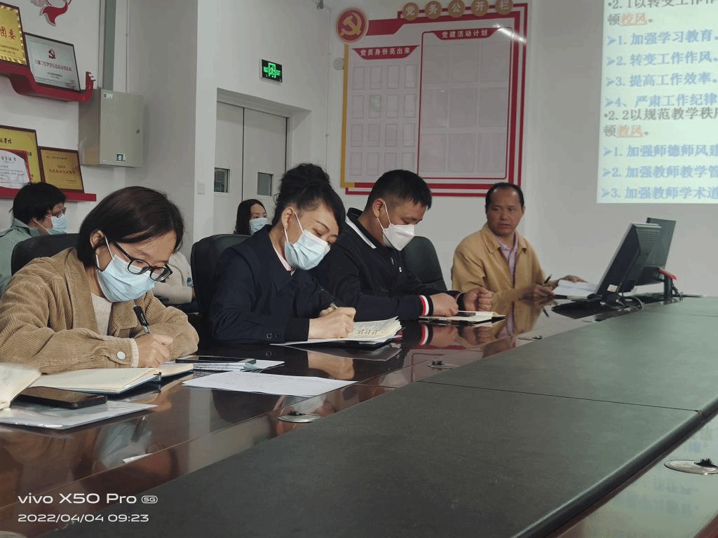 2022年4月4日上午9:00,化学生物与环境学院全体教职员工在实训大楼B-609党员活动中心开展校风教风学风专项整顿暨师德师风集体学习活动,活动由学院党委书记万永坤同志主持,学院全体教职员工参加。