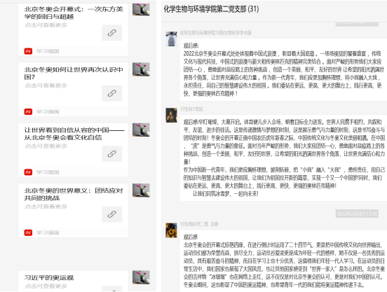 2022年2月24日12:00~21:00,化学生物与环境学院学生第二党支部在线开展2月份主题党日活动,全体党员同志在线学习了学习强国上北京冬奥会相关链接内容,纷纷在支部群里发表了观后感。