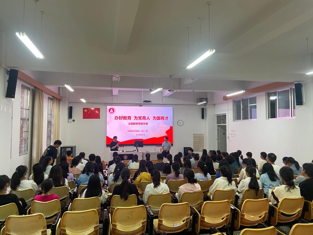 2023年6月7日晚,学校党委委员、副校长章新为化学生物与环境学院、数学与信息技术学院学生党员开展了以 “办好教育 为党育人 为国育才”为主题的学习贯彻习近平新时代中国特色社会主义思想主题教育专题党课。化学生物与环境学院党委书记万永坤、数学与信息技术学院党委书记张敏、化学生物与环境学院团委书记刘桥刚和近100名学生党员参加了此次专题党课。