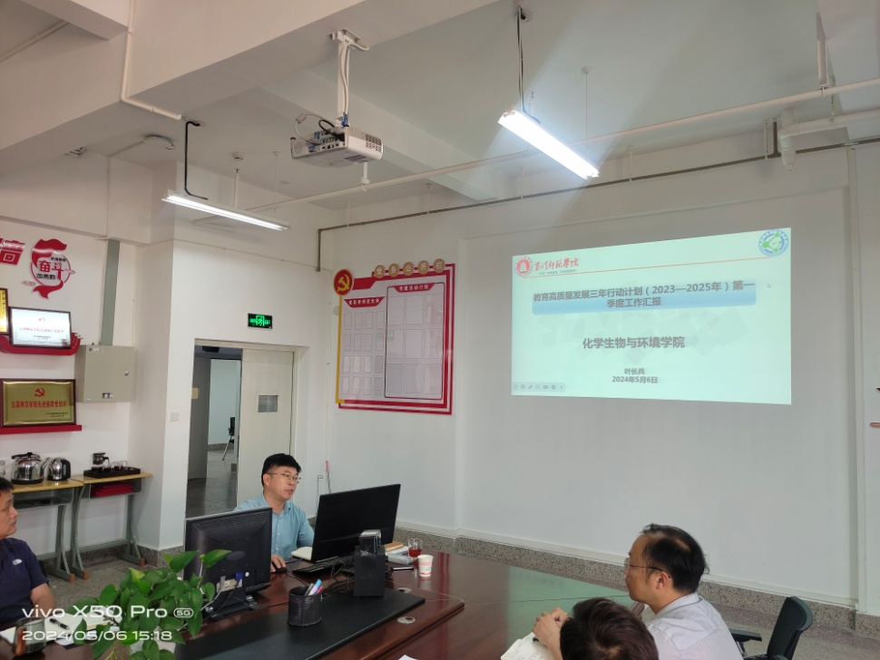 叶长兵院长以“化学生物与环境学院三年行动计划(2023—2025年)第一季度工作推进情况”为题做了主旨发言,从“工作成效、存在问题、未来计划”三个方面做了详细解读。