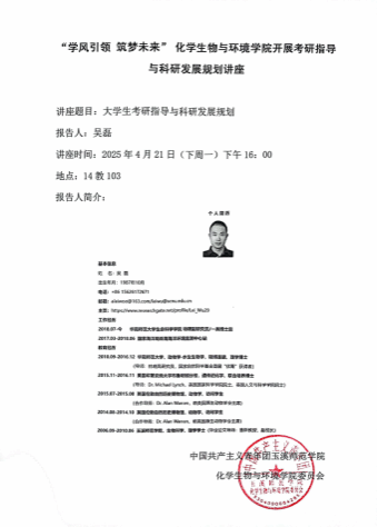 为帮助学生明确职业发展方向、科学规划考研路径,化学生物与环境学院于2024年4月21日在14教103开展“学风引领 筑梦未来”考研指导与科研发展规划活动,学院邀请杰出校友吴磊教授主讲。