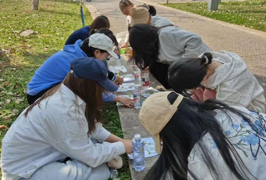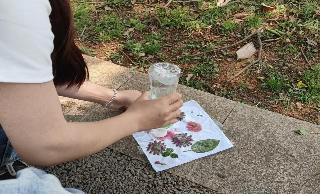 植物拓印是一种通过物理按压或敲击的方式,将植物的自然形态、色彩和纹理转移到布料、纸张或其他载体上的传统手工技艺,它属于植物染色的一种特殊形式,也是中国非物质文化遗产之一。2026年3月28日14:00-16:00,“自然与人”环保社团在学校后山举办了植物拓印手帕活动。本次活动面向全校同学开放,报名即可参加。活动吸引了来自教师教育学院、外国语学院、农学与生物科学学院、马克思主义学院、文学院、数理学院、法学院、音乐学院、商学院和工学院共90余名同学参与。